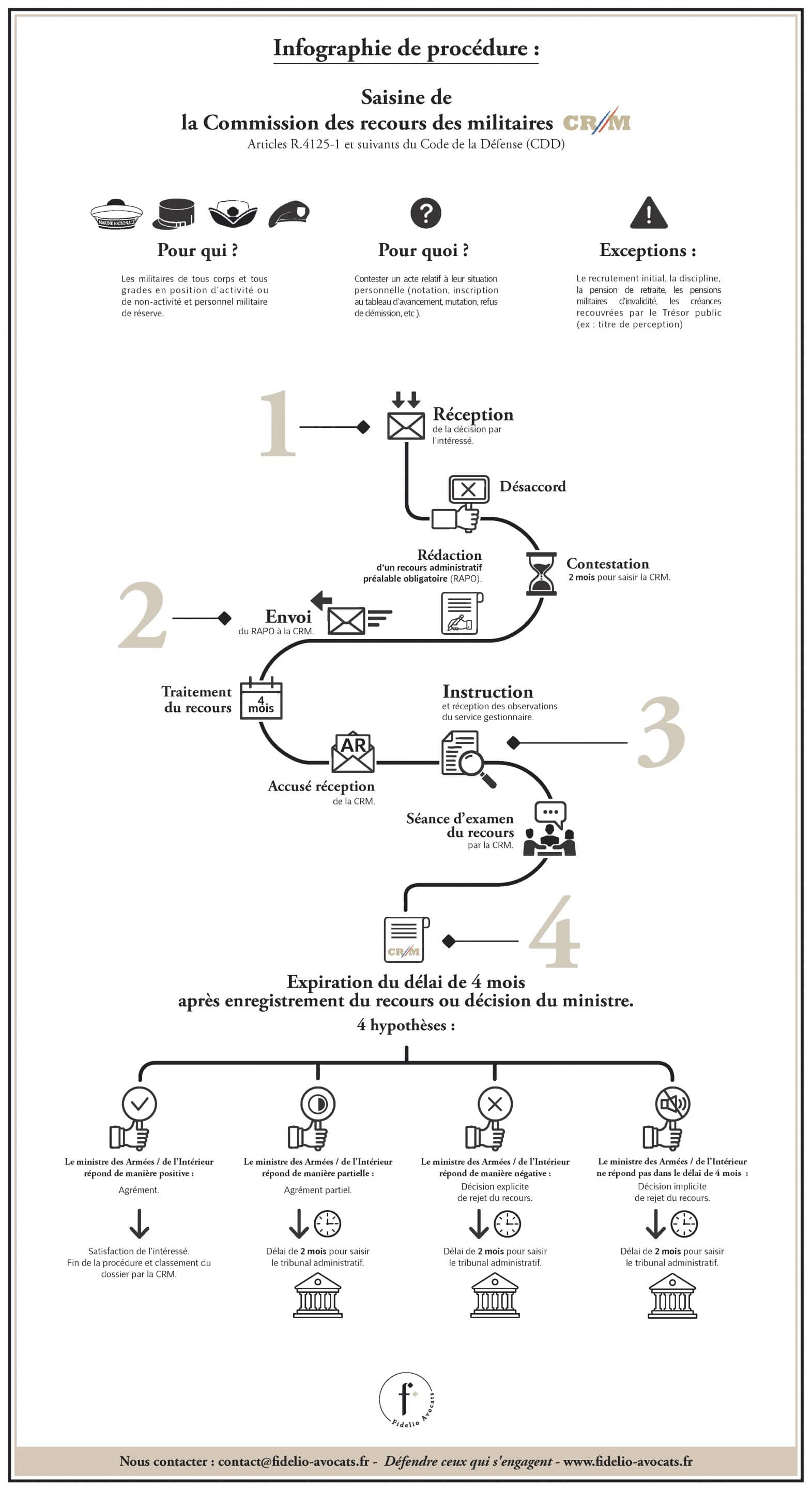 - Page officielle du ministère des Armées et des Anciens combattants : https://www.defense.gouv.fr/sga/au-service-armees/ressources-humaines/commission-recours-militaires-crm – Contact : Commission des recours des militaires, 14 rue Saint-Dominique -75700 Paris SP07 | Mail : crm.sec.fct@intradef.gouv.fr